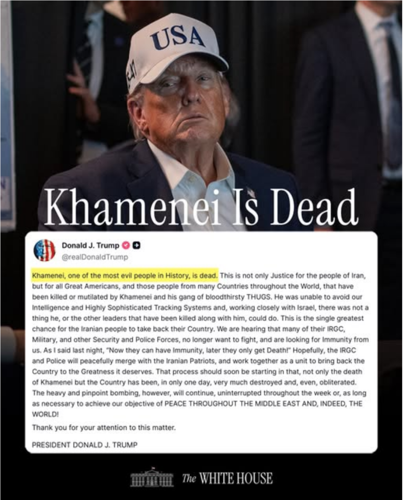 „Khamenei, unul dintre cei mai răi oameni din istorie, a murit. Aceasta este dreptate nu doar pentru poporul iranian, ci și pentru toți marii americani și pentru oamenii din multe țări din întreaga lume care au fost uciși sau mutilați de Khamenei și de banda sa de criminali însetați de sânge.