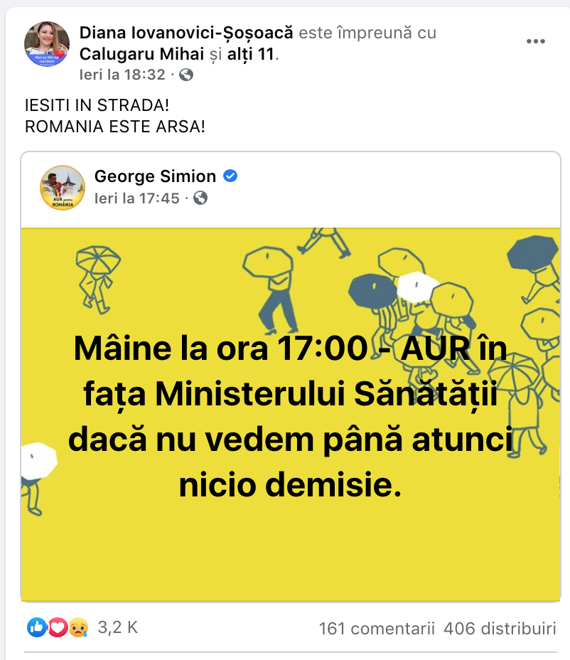 Mai mult, a distribuit un anunț al șefului său de partid, George Simion, prin care acesta chema lumea la mitingul de sâmbătă. „Ieșiți în stradă! România este arsă!”, i-a îndemnat Șoșoacă pe fanii ei. N-au prea venit, au fost puțini la mitingul AUR-ist, dar… Șoșoacă n-a venit deloc!