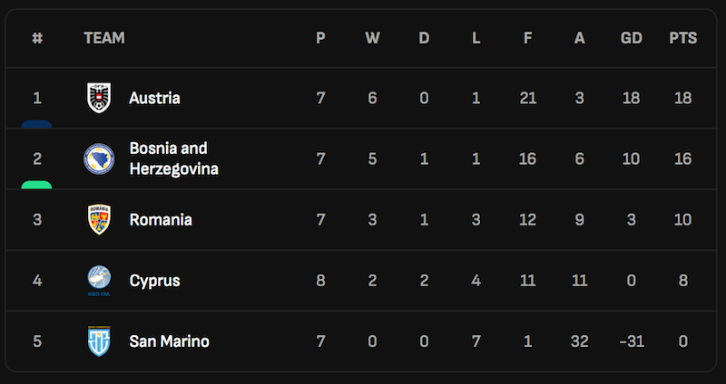 2–1–3 cu Austria, Bosnia și Cipru. Golaveraj 7-8