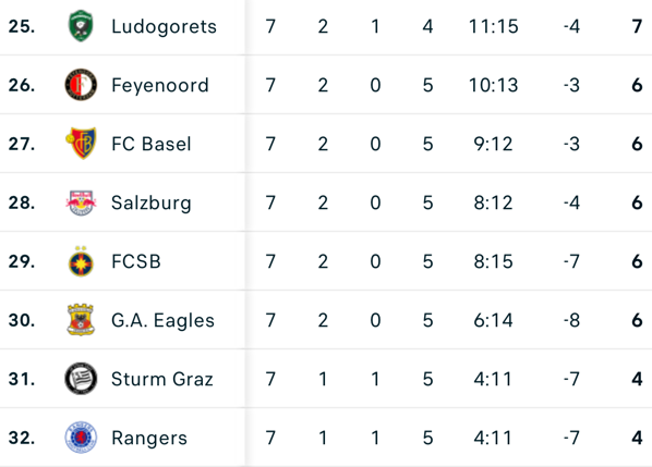 La trei goluri diferență a mai pierdut doar Sturm Graz: 0-3 pe terenul lui Feyenoord Rotterdam, învinsa lui FCSB în thriller-ul din etapa precedentă, la București (3-4).