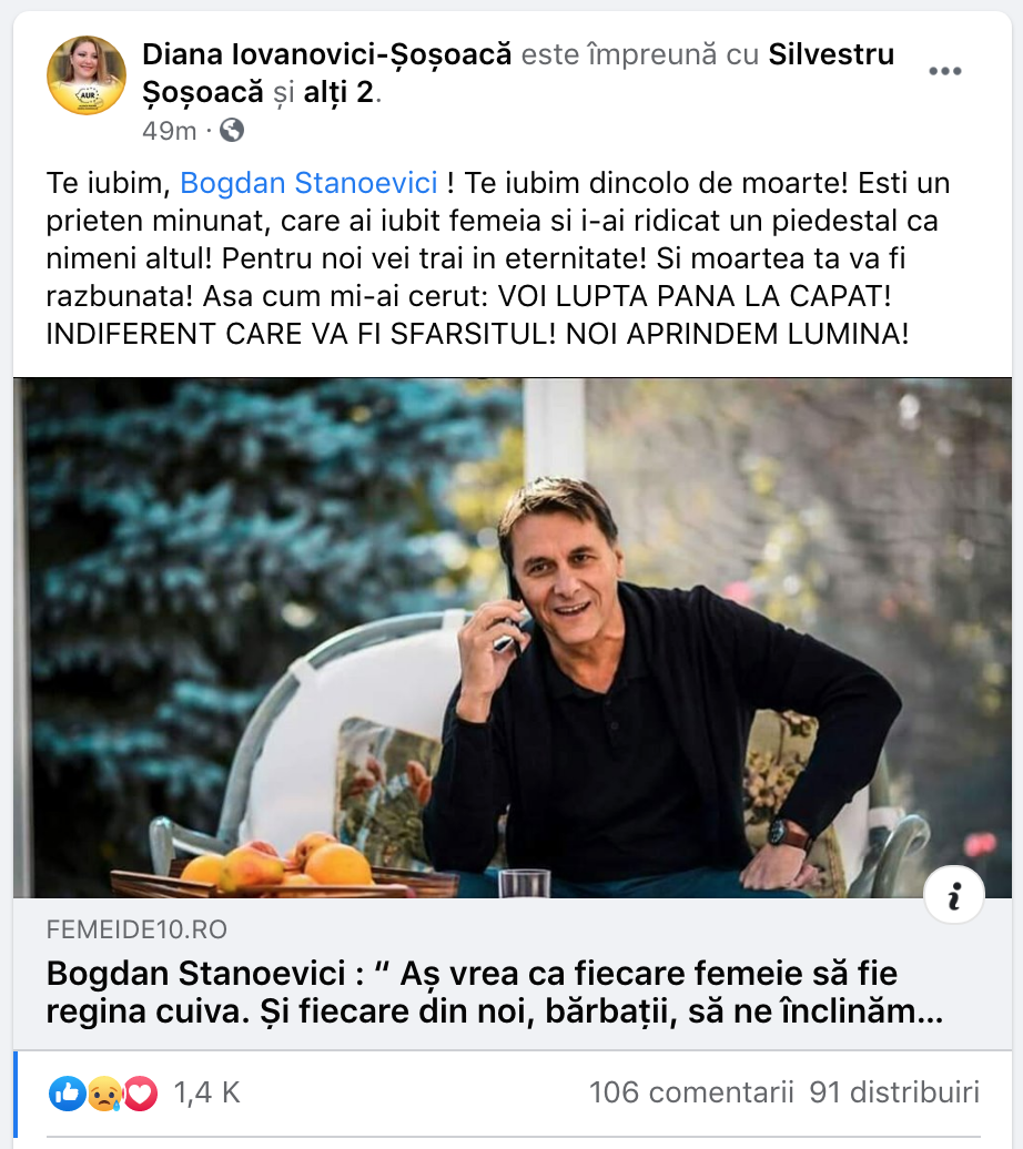 „Pentru toți «deștepții» din media: Bogdan Stanoevici nu a murit de Covid! Se vindecase la două săptămâni după internare. Bogdan avea afecțiuni de o viață, care nu i-au fost tratate. La 62 de ani, arăta ca la 45. M-a rugat să lupt până la capăt și să nu mă las. Aviz amatorilor și criminalilor din sistem! Nu ne puteți omorî pe toți!”