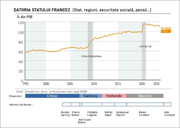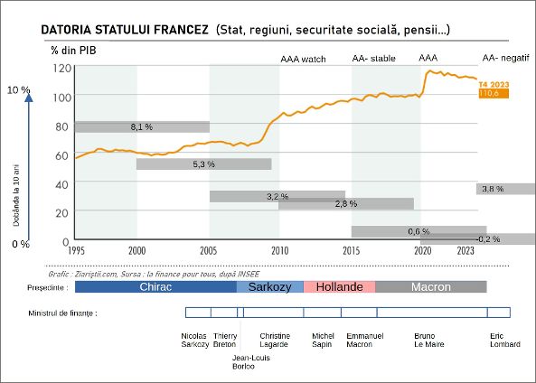 Sarkozy a împrumutat mult, cu dobânzi ridicate. În perioada Macron, în ciuda pandemiei de Covid-19 și a războiului din Ucraina, Franța se împrumută cu dobânzi negative. Curbele datoriei post-Covid sunt chiar descendente.