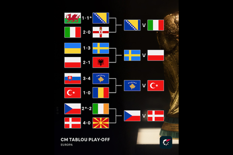 Cele patru „finale” de play-off care se vor juca marți de la aceeași oră, 21.45, vor stabili ultimele ocupante europene ale unui loc la Cupa Mondială 2026 organizată de Canada, Mexic și SUA.