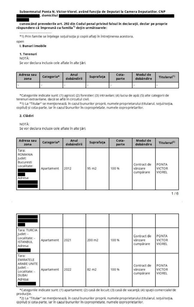 DOCUMENT: În declarația de avere a lui Victor Ponta apare și un apartament de 82 de metri pătrați în Dubai