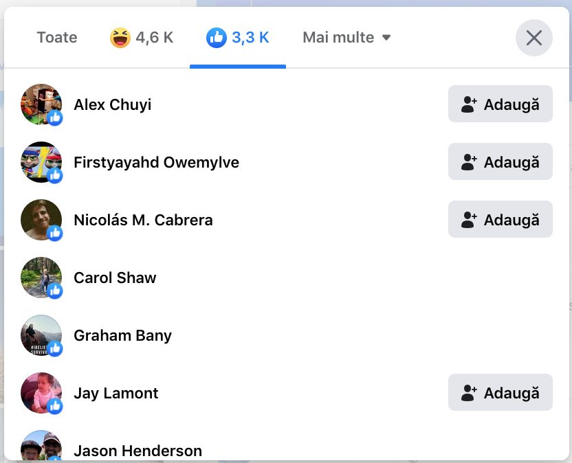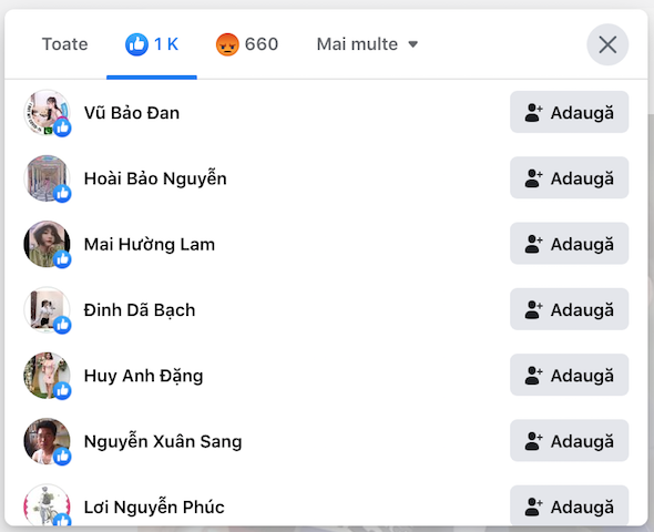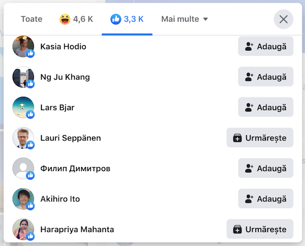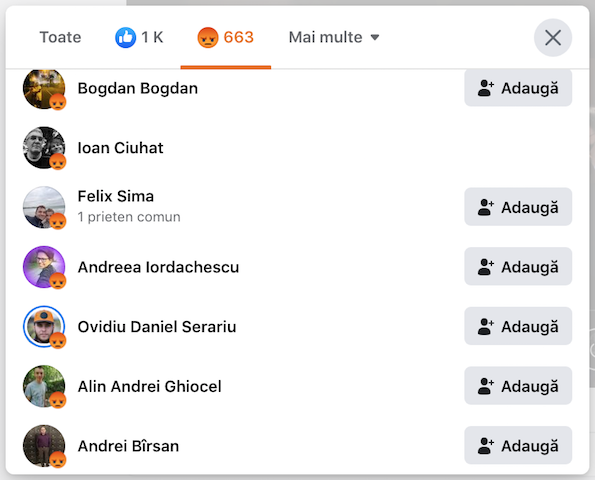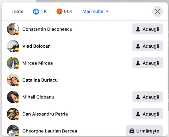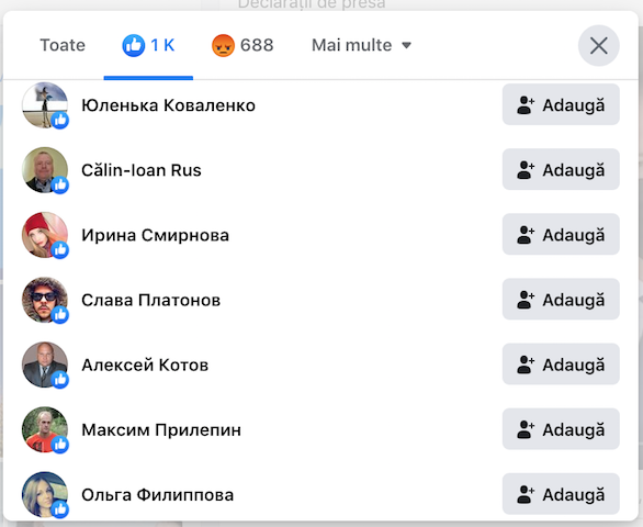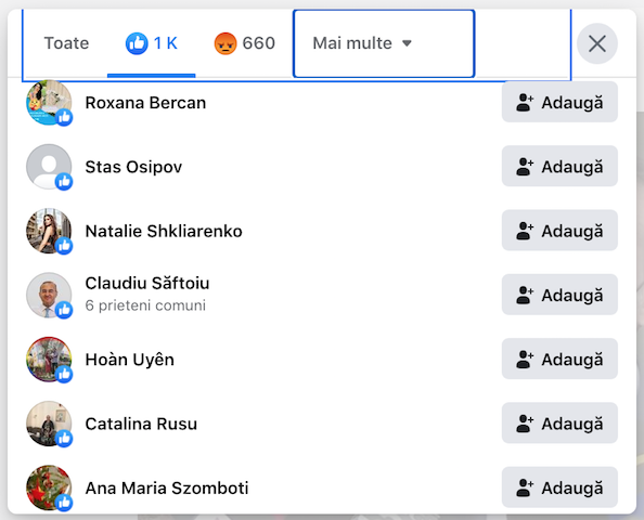 Dacă parcurgi doar lista cu reacții de apreciere, observi că cel mult 10% sunt conturi cu nume românești și chiar o parte dintre acestea par să fie false.