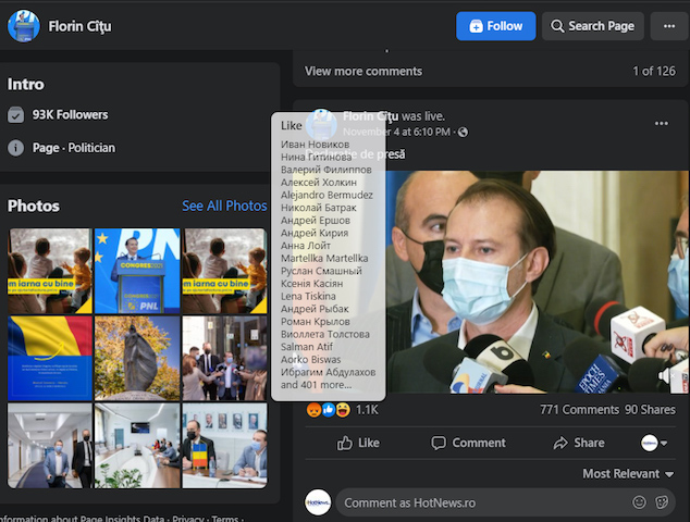 De 8 zile, postările de pe pagina de Facebook a premierului Florin Cîțu, care beneficiază de peste 93.000 de urmăritori (cam puțin; prin comparație, pagina Grigore Cartianu are peste 147.000) se bucură de aprecierea bruscă, sinceră și necondiționată a unor cetățeni din Vietnam, din foste țări sovietice (mai ales Rusia), din Africa și din lumea arabă.