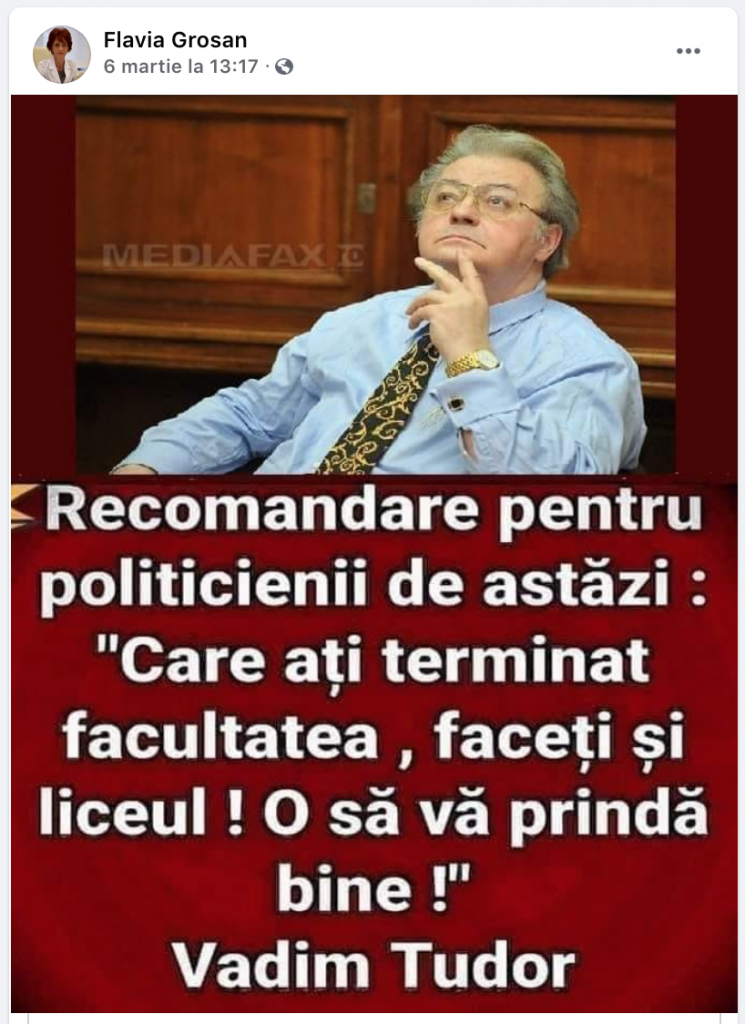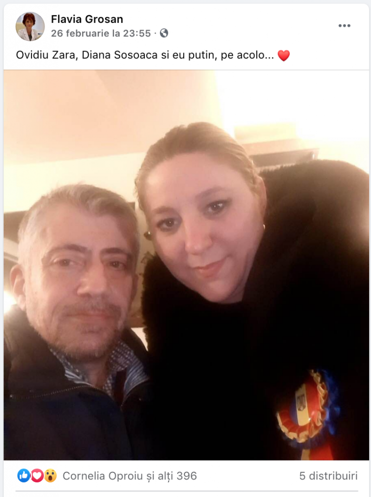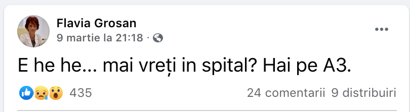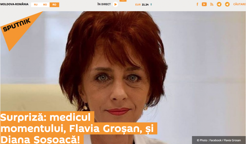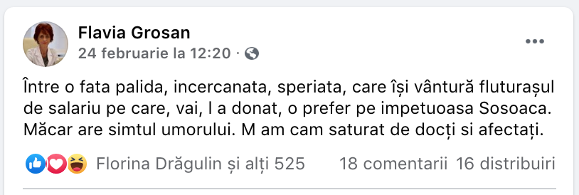 O incursiune pe pagina de Facebook a Flaviei Groșan, cea prezentată drept „doctorița-minune de la Oradea” de propaganda conspiraționistă, ne arată un personaj cu grave probleme de raportare la realitate. Este fan Șoșoacă, distribuie intens postările Danei Budeanu, ia lumină de la Antena 3 și România TV, urăște mișcarea #Rezist, pronunță cu evlavie numele Dragnea și Dăncilă, suspină după Dan Diaconescu și OTV, citează din răposatul C. V. Tudor, e fericită să se pozeze cu Ovidiu Zară, se hrănește din prostiile rostogolite de Aurelian Pavelescu și se închină la icoana lui Bogdan Stanoevici, cel căzut eroic în lupta cu masca de protecție.