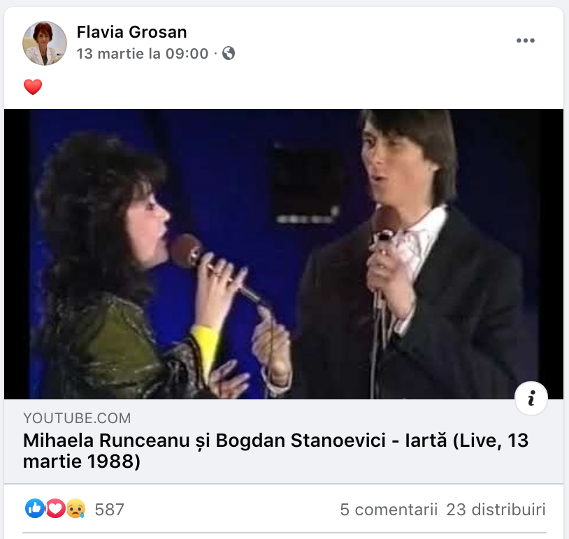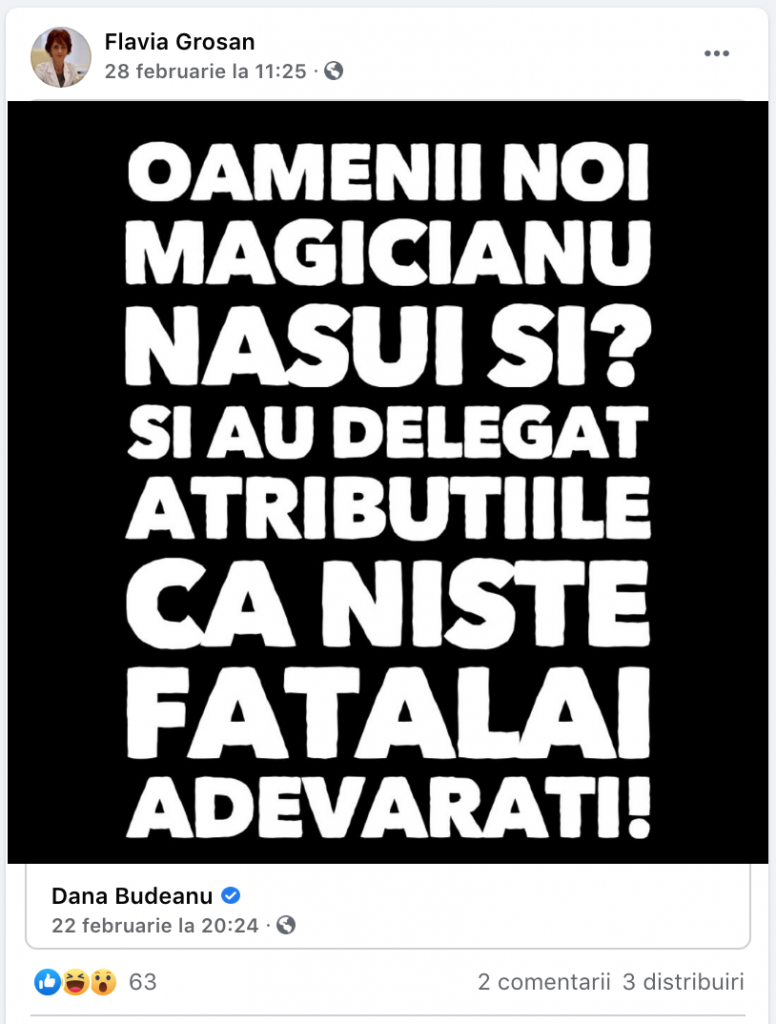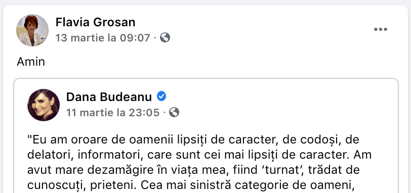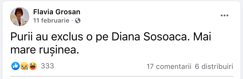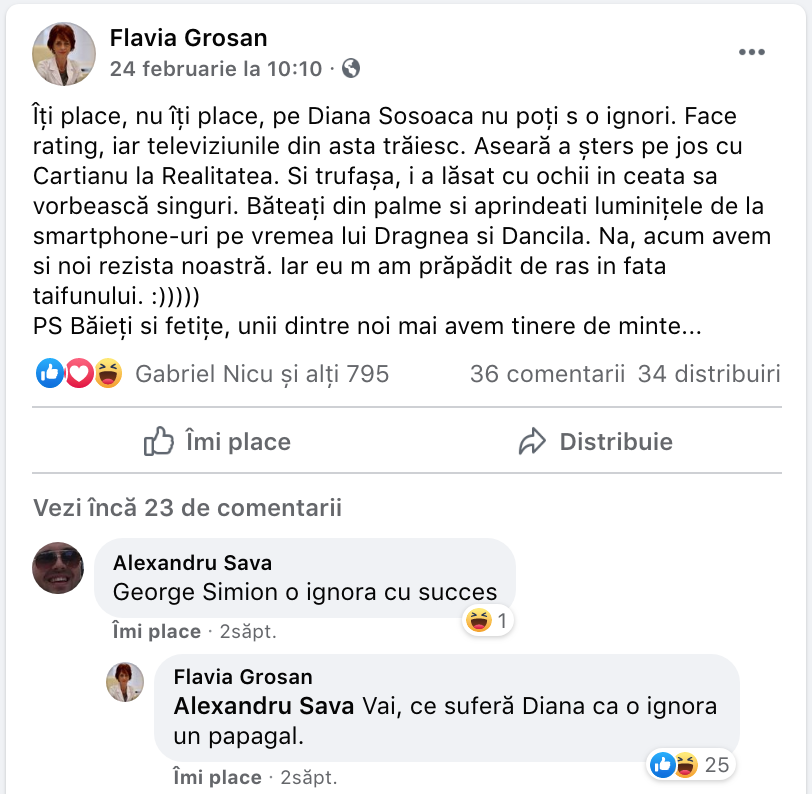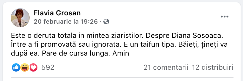 24 februarie: „Îți place, nu îți place, pe Diana Șoșoacă nu poți s-o ignori. Face rating, iar televiziunile din asta trăiesc. Aseară a șters pe jos cu Cartianu la Realitatea. Și trufașă, i-a lăsat cu ochii în ceață, să vorbească singuri. Băteați din palme și aprindeați luminițele de la smartphone-uri pe vremea lui Dragnea și Dăncilă. Na, acum avem și noi r#ezista noastră! Iar eu m-am prăpădit de râs în fața taifunului”.