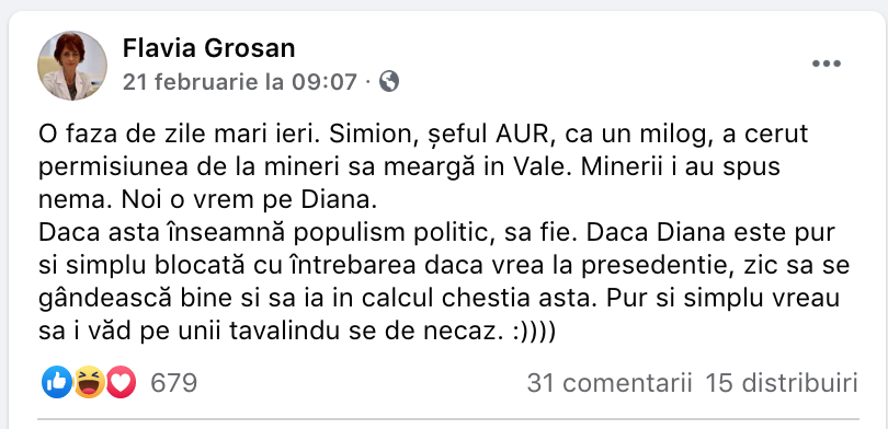 21 februarie: „O fază de zile mari, ieri. Simion, șeful AUR, ca un milog, a cerut permisiunea de la mineri să meargă în Vale. Minerii i-au spus nema. «Noi o vrem pe Diana». Dacă asta înseamnă populism politic, să fie. Dacă Diana este pur și simplu blocată cu întrebarea dacă vrea la Președenție, zic să se gândească bine și să ia în calcul chestia asta. Pur și simplu, vreau să-i văd pe unii tăvălindu-se de necaz”.