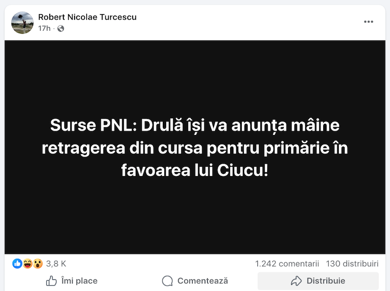 Postarea lui Cătălin Drulă a venit la scurt timp după ce Robert Turcescu a lansat următoarea intoxicare: „Surse PNL: Drulă își va anunța mâine retragerea din cursa pentru primărie în favoarea lui Ciucu!”.