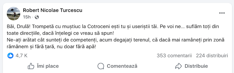 După replica lui Drulă, „trompeta Turcescu” a revenit cu un mesaj mizerabil, de-a dreptul vulgar: „Băi, Drulă! Trompetă cu muștiuc la Cotroceni ești tu și useriștii tăi. Pe voi ne… suflăm toți din toate direcțiile, dacă înțelegi ce vreau să spun! Ne-ați arătat cât sunteți de competenți, acum degajați terenul, că dacă mai ramâneți prin zonă rămânem și fără țară, nu doar fără apă!”.