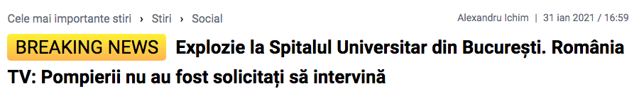 „Breaking News: Explozie la Spitalul Universitar din București. România TV: Pompierii nu au fost solicitați să intervină”
