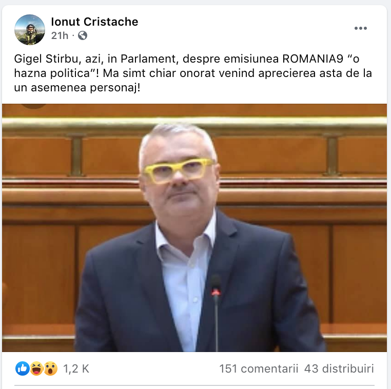 “Gigel Știrbu, azi, în Parlament, despre emisiunea ROMÂNIA9 «o hazna politică»! Mă simt chiar onorat venind aprecierea asta de la un asemenea personaj!”, a scris Cristache.