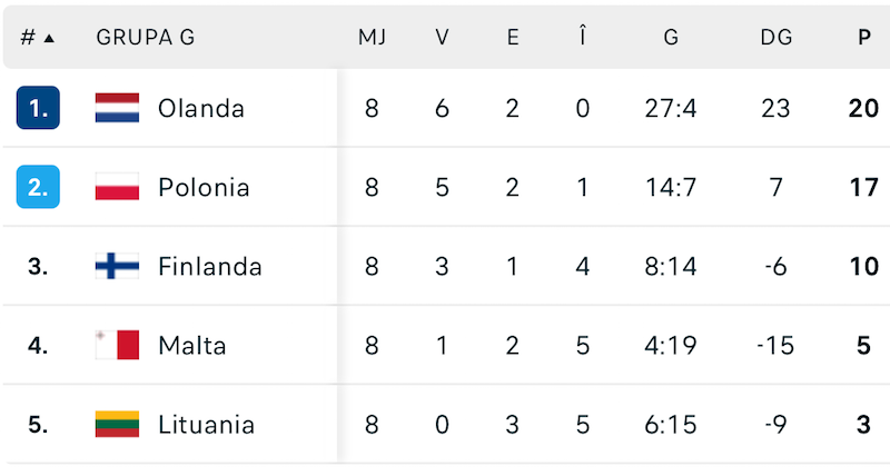 Polonia avea garantat locul 2, dar păstra o miză majoră: doar victoria în Malta ar fi urcat-o printre cei patru capi de serie la tragerea la sorți pentru play-off. Iar victoria a venit greu, cu mari emoții, în minutul 85. Acum, polonezii sunt cu ochii pe meciurile Scoția – Danemarca și Austria – Bosnia și le țin pumnii favoritelor: dacă danezii și austriecii nu pierd, atunci Polonia rămâne în prima urnă valorică și va juca primul meci din play-off pe teren propriu.
