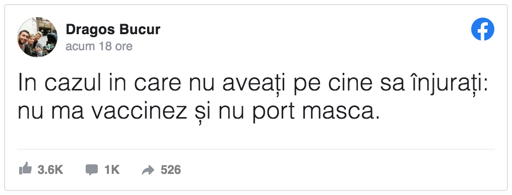 „În cazul în care nu aveţi pe cine să înjuraţi: nu mă vaccinez şi nu port mască”, a scris Dragoș Bucur pe pagina sa de Facebook.