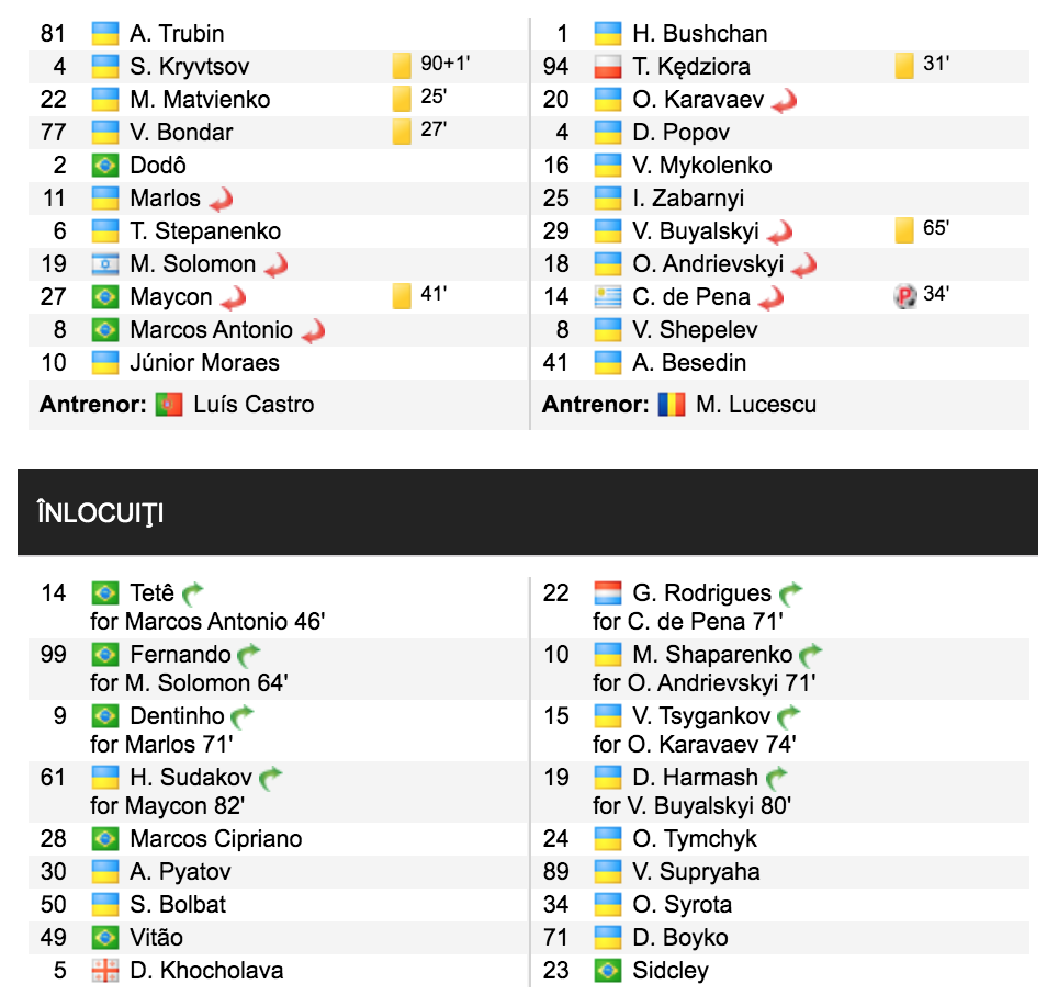 - Dinamo Kiev a avut printre titulari 9 ucraineni, plus un polonez (Kedziora) și un uruguayan (De Pena). Pe parcurs au mai intrat trei ucraineni și un luxemburghez de origine portugheză (Gerson Rodrigues).