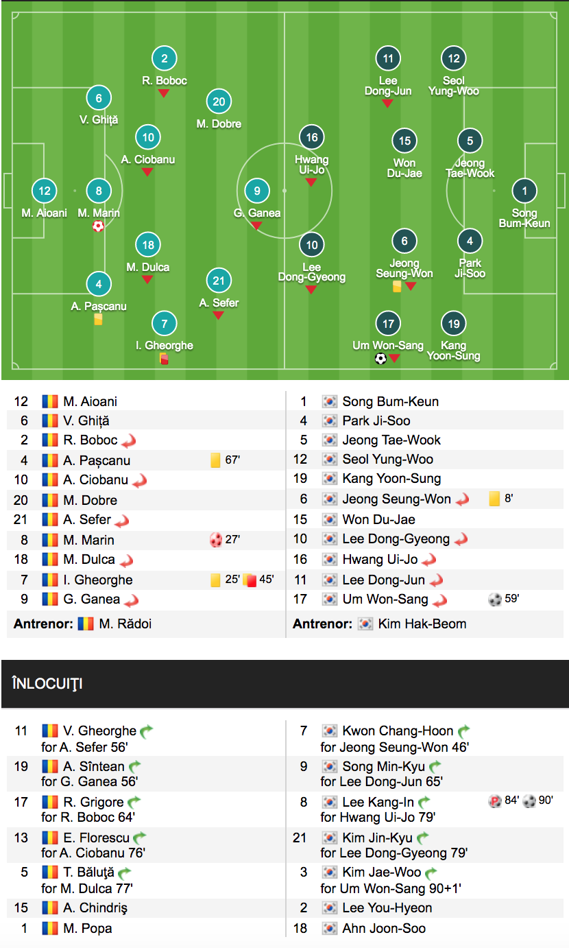 • Goluri: M. Marin (27 – autogol), Um Won Sang (59), Lee Kang In (84 – din penalty, 90).