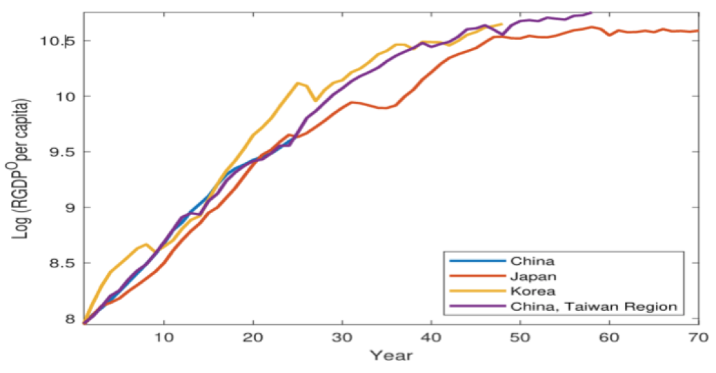 Graficul de mai sus ilustrează evoluția PIB-ului real pe locuitor (asupra căruia a fost aplicat operatorul de logaritmare) în cazul Chinei, Japoniei, Coreei de Sud și Taiwanului. Datele arată clar că traiectoria urmată de China este foarte asemănătoare cu cea a celorlalte trei economii est-asiatice, considerate exemple de succes.