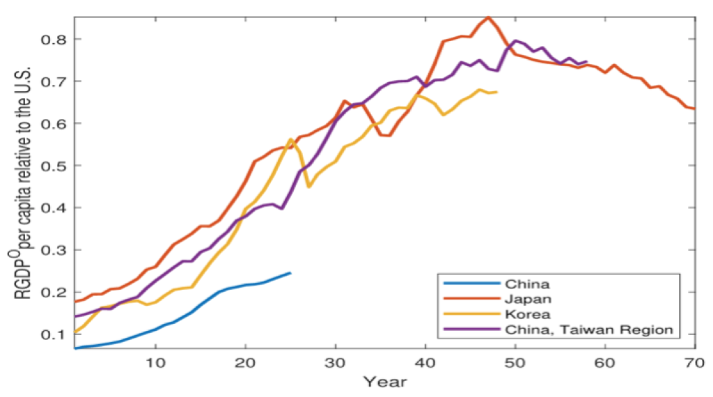 Din grafic se poate observa faptul că la aproximativ 25 de ani după ce au atins statutul de economii cu venituri medii, China, Japonia și Taiwan au ajuns la niveluri similare ale PIB-ului real pe locuitor. Singura excepție este Coreea de Sud, care a înregistrat progrese ceva mai rapide. Aceste observații sugerează că ritmul de creștere al PIB-ului real al Chinei nu diferă în mod semnificativ de cel al acestor economii.