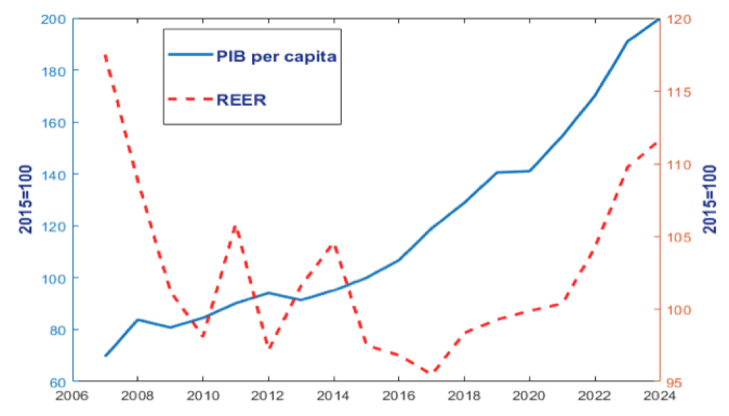 Figura 3: Evoluția PIB pe locuitor și a cursului real de schimb în România