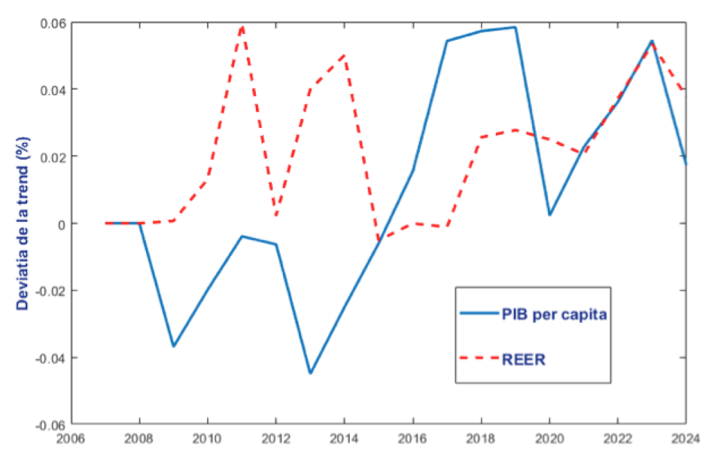 Din figura 4 se poate observa tendința similară urmată de componentele ciclice ale PIB pe locuitor și ale măsurii REER pentru cursul real de schimb începând cu anul 2017. Până la începutul pandemiei Covid-19, componenta ciclică a variabilei PIB pe locuitor manifesta modificări de o magnitudine net superioară celei observate în cazul cursului real de schimb. În schimb, după izbucnirea pandemiei, cele două componente ciclice au înregistrat evoluții foarte apropiate, atât în termeni de tendință, cât și de magnitudine.