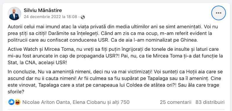 Precizare importantă: în replicile sale vitriolante, Silviu Mănăstire n-a răspuns la niciuna dintre acuzațiile care-i fuseseră aduse prin articolul din G4Media.ro. N-a contrazis nimic concret, doar a înjurat și a amenințat.