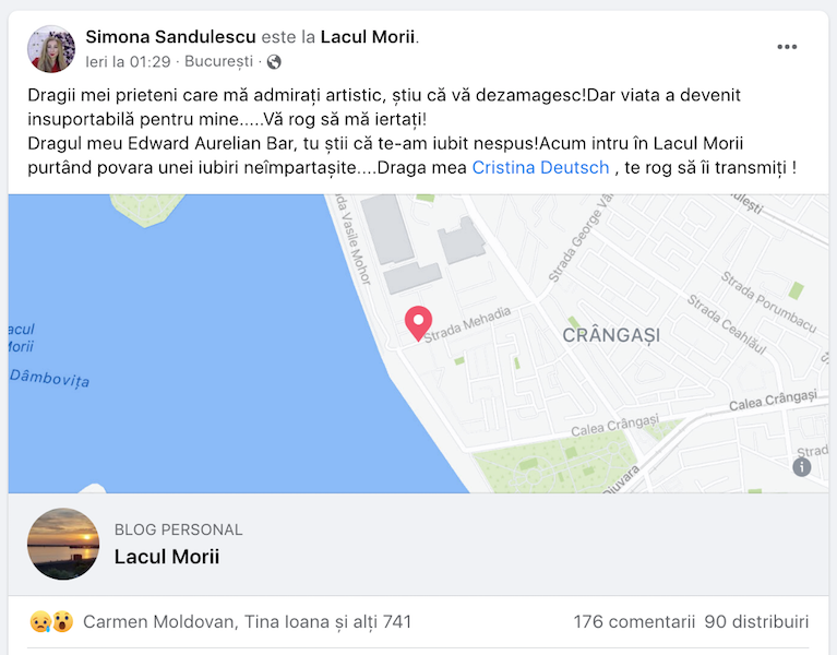 […] * Mesajul de adio al artistei care s-a sinucis la a 5-a încercare, înecându-se în Lacul Morii. A a… […]