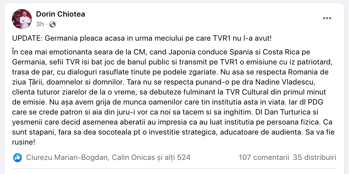 „Audiențele de aseară ale TVR 1 au fost de vreo 15 de ori mai mici decât în zilele cu meciuri de la FIFA World Cup 2022. Puteau măcar SĂ ANUNȚE PE CRAWL unde se desfășura partida Costa Rica vs Germania, așa îți respecți telespectatorii din banii cărora trăiești. Iar TVR INFO a fost în general în nota obișnuită.