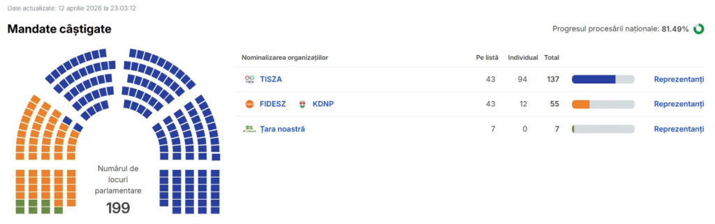 Înfrângerea ”suveranistului” Viktor Orban este confirmată de numărarea voturilor: este un eșec zdrobitor al prim-ministrului care a scos Ungaria de pe traiectoria democrației liberale și a transformat-o în ”oaia neagră” a Europei. După numărarea voturilor din 81,49% dintre secțiile de votare, partidul de opoziție Tisza (pro-european, anti-putinist) ar avea 137 din cele 199 de mandate de deputat din Parlamentul de la Budapesta, adică 68,84% – o majoritate constituțională, de peste două treimi.