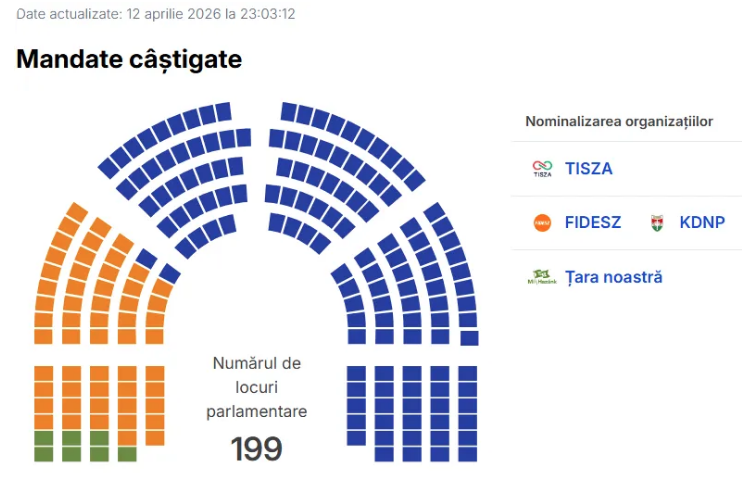Înfrângerea ”suveranistului” Viktor Orban este confirmată de numărarea voturilor: este un eșec zdrobitor al prim-ministrului care a scos Ungaria de pe traiectoria democrației liberale și a transformat-o în ”oaia neagră” a Europei. După numărarea voturilor din 81,49% dintre secțiile de votare, partidul de opoziție Tisza (pro-european, anti-putinist) ar avea 137 din cele 199 de mandate de deputat din Parlamentul de la Budapesta, adică 68,84% – o majoritate constituțională, de peste două treimi.