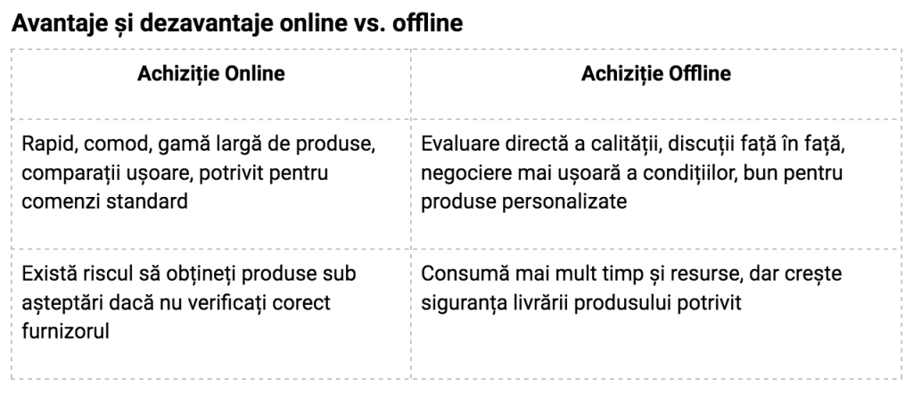 Prețul contează, dar nu ar trebui să fie principalul criteriu. Un cost foarte mic poate ascunde o calitate slabă. Solicitați oferte detaliate, cu mențiuni clare despre preț pe unitate, transport, taxe etc.! Luați în calcul calitatea și timpul de livrare garantat!
