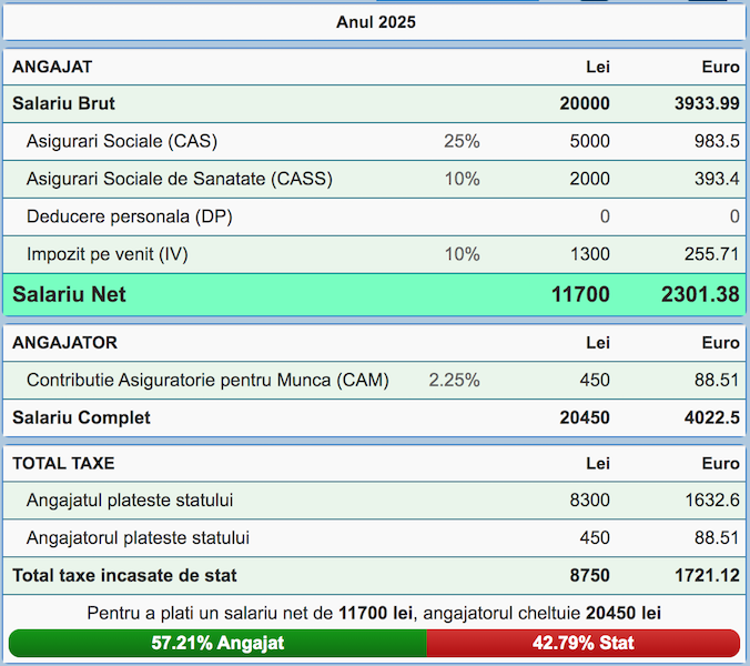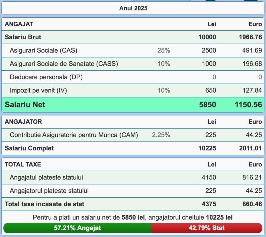 Exemplu: la un salariu brut de 10.000 de lei (sumă rotundă, pentru simplificarea calculelor, dar evident mai mică decât salariile reale), angajatul-magistrat încasează 5.850 de lei, iar statul reține 4.150 de lei, distribuiți astfel: 2.500 de lei – asigurări sociale (CAS); 1.000 de lei – asigurări sociale de sănătate (CASS); 650 de lei – impozit pe venit.