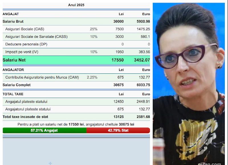 Exemplu: la un salariu brut de 10.000 de lei (sumă rotundă, pentru simplificarea calculelor, dar evident mai mică decât salariile reale), angajatul-magistrat încasează 5.850 de lei, iar statul reține 4.150 de lei, distribuiți astfel: 2.500 de lei – asigurări sociale (CAS); 1.000 de lei – asigurări sociale de sănătate (CASS); 650 de lei – impozit pe venit.