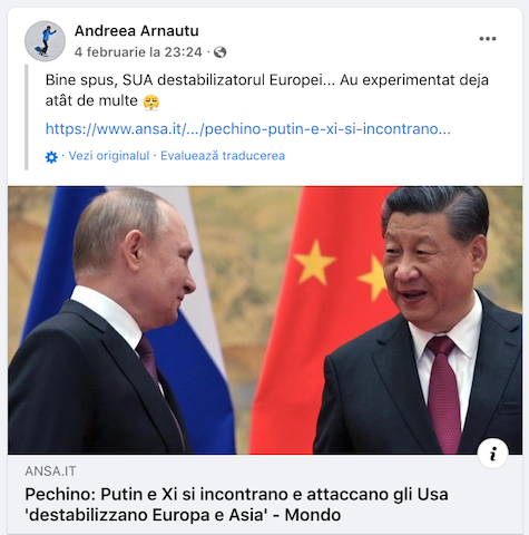 Pe 4 februarie, fruntașa liberală a promovat o știre difuzată de agenția ANSA, cu titlul: „Beijing: Putin și Xi se întâlnesc și atacă SUA, care «destabilizează Europa și Asia»”. Știrea era ilustrată cu poză în care apar Vladimir Putin și Xi Jinping, la deschiderea Jocurilor Olimpice de iarnă din capitala Chinei. Comentariul Andreei Arnăutu este înfiorător: „Bine spus, SUA – destabilizatorul Europei… Au experimentat deja atât de multe”. Altfel spus, Putin și Xi au dreptate, America nu apără, ci „destabilizează” Europa!