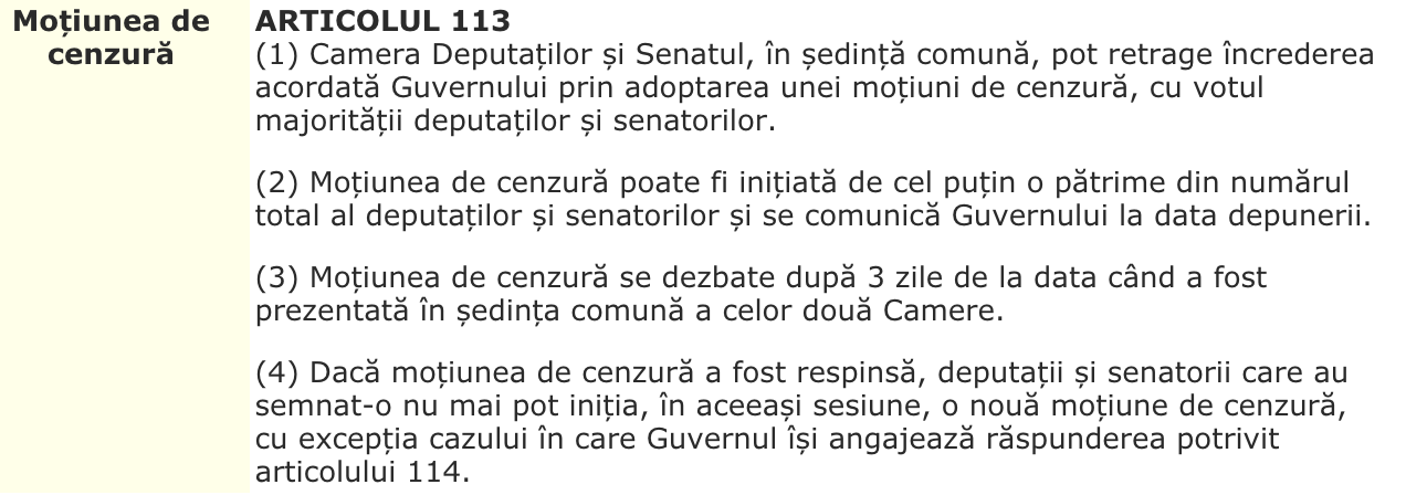 „Moţiunea de cenzură se dezbate după 3 zile de la data când a fost prezentată în şedinţa comună a celor două Camere”.