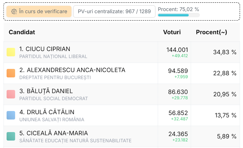 Până la ora 22.50 au fost centralizate procesele-verbale din 75,02% din totalul secțiilor de votare (967 din 1.289). Ciprian Ciucu (PNL) și-a mărit avansul față de Anca Alexandrescu („independentă AUR”) la aproape 12 procente (34,83% – 22,88%), respectiv 49.412 voturi (144.001 – 94.589).