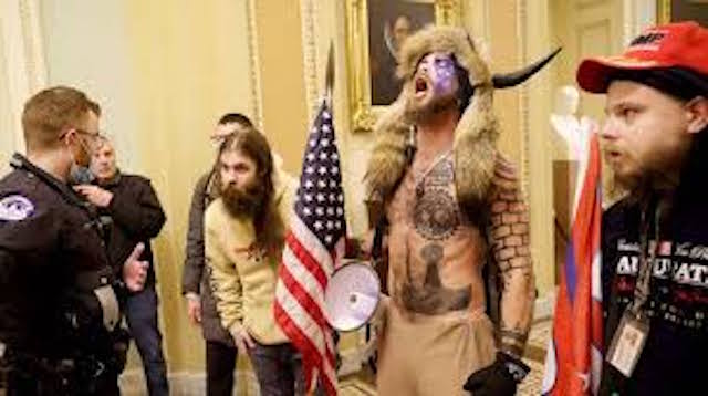 „Șamanul QAnon” a fost fotografiat în clădirea Capitoliului purtând o pălărie cu coarne și pictat pe față cu steagul Statelor Unite. El este cunoscut în cercurile QAnon ca un înfocat susținător al ridicolelor teorii conspiraționiste ale extremei drepte americane.