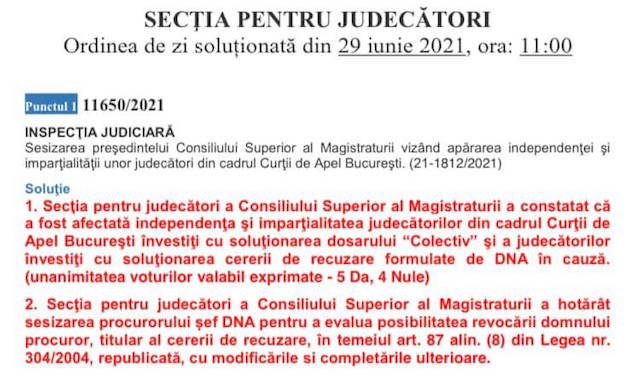 Marți, 29 iunie, Secția pentru judecători a Consiliului Superior al Magistraturii (CSM) „a hotărât sesizarea procurorului-șef al DNA pentru a evalua posibilitatea revocării domnului procuror, titular al cererii de recuzare (…)”.