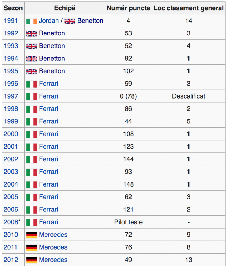 Michael Schumacher a fost primul sportiv care a câștigat în cariera sa peste un miliard de dolari. Germanul este considerat de mulți cunoscători ai automobilismului drept cel mai bun pilot din istoria Formulei 1. A fost campion mondial de 7 ori: în 1994 și 1995 cu Benetton, în 2000, 2001, 2002, 2003 și 2004 cu Ferrari (ambele, mărci italiene). A fost pilot de Formula 1 timp de 22 de ani (1991-2012), participând la 19 ediții ale Campionatului Mondial (care se desfășoară în circuit anual). În perioada 2007-2009 s-a retras, în 2010 a revenit în circuit, pe o mașină Mercedes, dar fără succes.
