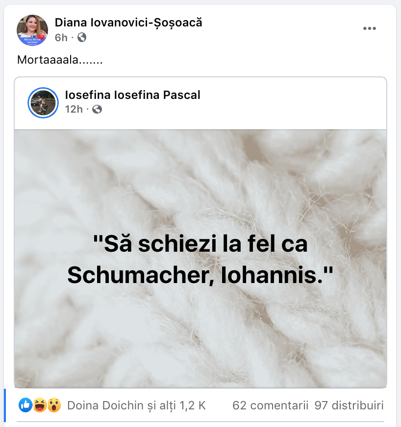 „Să schiezi la fel ca Schumacher, Iohannis”, scrie Iosefina Pascal, agramat (lipsește un semnul exclamării), iar tovarășa ei de conspirații rusești, Diana Șoșoacă, distribuie postarea și adaugă: „Mortaaaală…….”.