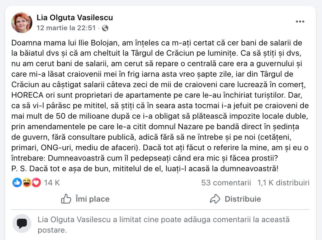 Temperamentul de mahalagioaică al PSD-istei Lia Olguța Vasilescu a erupt din nou, vineri, pe Facebook. Primărița Craiovei a sărit s-o pună la punct, pe un ton miștocăresc-golănesc, pe mama premierului Ilie Bolojan – o femeie simplă, de la țară, în vârstă de 87 de ani, care îndrăznise să-și dea cu părerea despre scena politică.