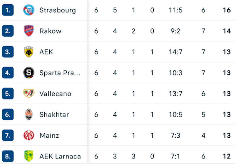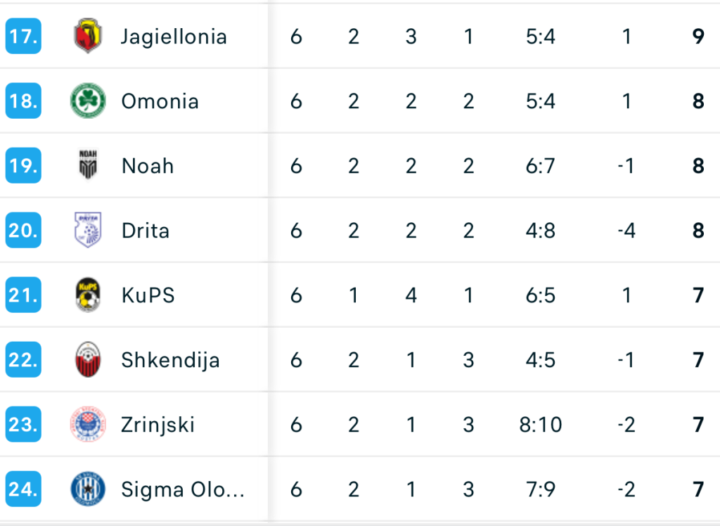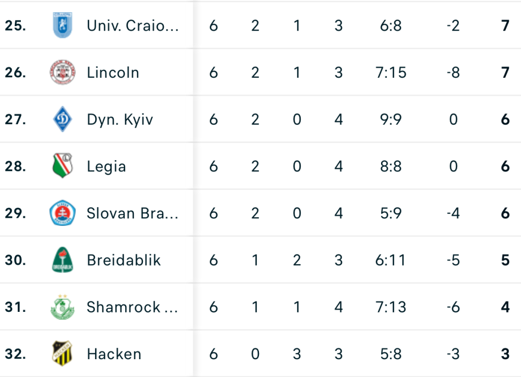 • AEK Larnaca (Cipru) – Shkendija (Macedonia de Nord) 1-0: Rămași în 10 oameni în minutul 53, nord-macedonenii au fost învinși printr-un gol primit în minutul 83. Dacă ar fi încasat încă un gol, ar fi căzut pe locul 28 (cu 6 puncte), iar Craiova – pe 24.