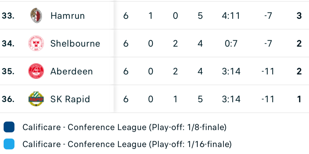 • Zrinjski (Bosnia) – Rapid Viena (Austria) 1-1: Trimis pe teren în minutul 79, fundașul sârb Cvetkovici (29 de ani), de la Rapid Viena, și-a dat autogol în minutul 90+3, când echipa sa conducea cu 1-0 (marcase Schaub, în min. 11). Fără acel autogol, Zrinjski s-ar fi clasat pe locul 28 (cu 6 puncte), iar Craiova – pe 24.
