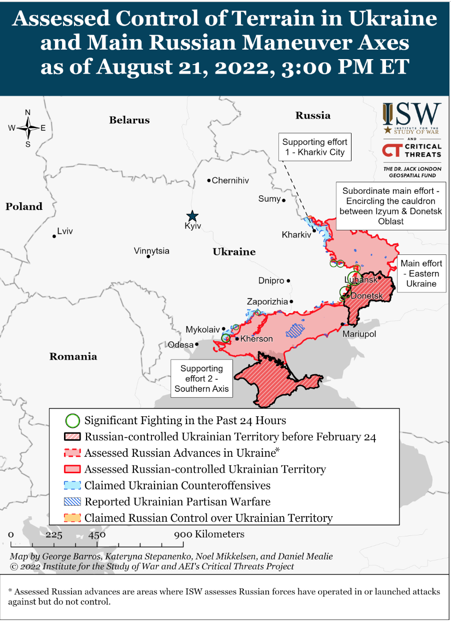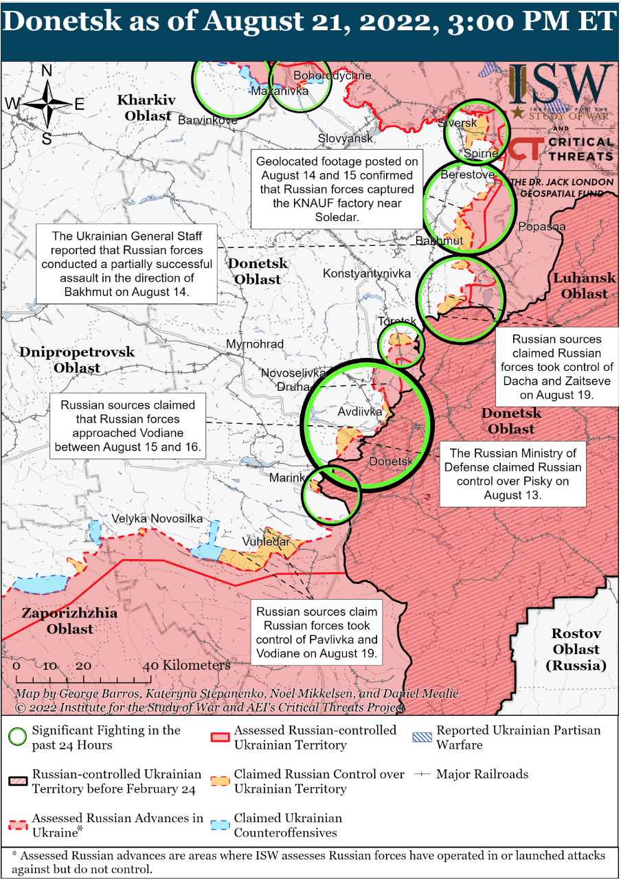 - „Ofensiva forțelor ruse din câștigurile teritoriale din jurul Bahmut și Avdiivka de la sfârșitul lunii iulie este probabil epuizată. Atacurile rusești în estul Ucrainei au atins punctul culminant, deși progresele foarte mici vor continua probabil.”