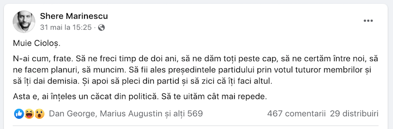 Șerban Marinescu, manager de proiect în cadrul Secretariatului General al USR și fost consilier parlamentar, îl atacă violent pe fostul său șef de partid, Dacian Cioloș, după demisiile succesive ale acestuia din USR (din funcția de președinte, apoi din poziția de membru).