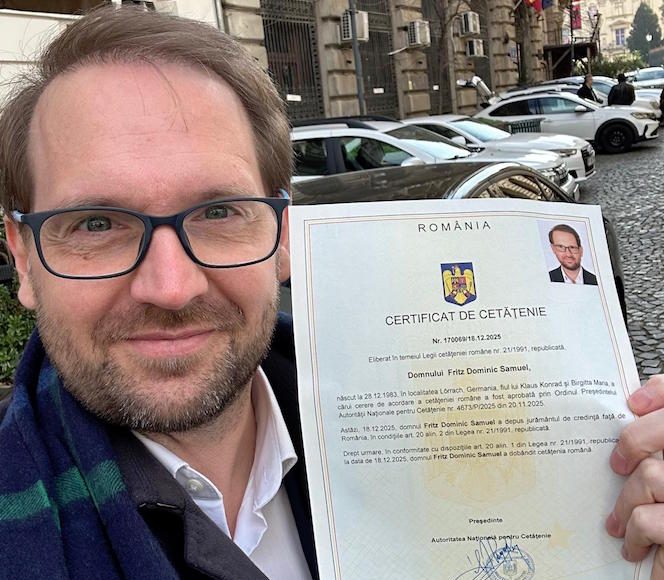 Primarul Timişoarei, Dominic Fritz, care e și preşedintele USR, a depus joi – 18 decembrie – jurământul de credinţă faţă de România, devenind cetăţean al ţării. El a mulţumit României „pentru braţele deschise” şi Timişoarei pentru că „îi este acasă”.