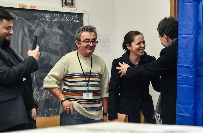 Mirabela Grădinaru și Nicușor Dan au schimbat câteva cuvinte, râzând, la intrarea în secția de votare, înainte ca președintele să se îndrepte spre comisia de votare (semnătură în tabel, ștampilă, buletin de vot).