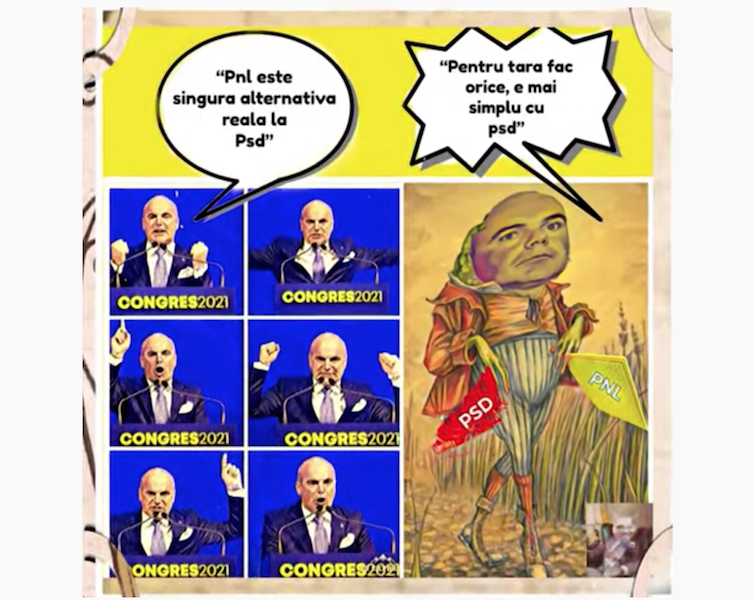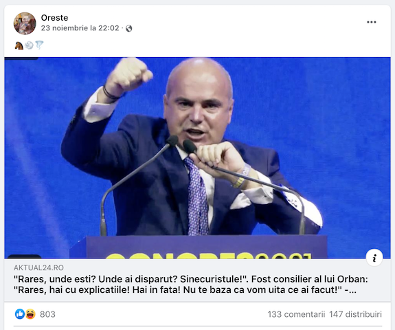 Oreste pune în contrast, în aceeași notă satirică, mesajele transmise de Rareș Bogdan la interval de două luni: „PNL este singura alternativă reală la PSD” (25 septembrie 2021), respectiv „Pentru țară fac orice / E mai simplu cu PSD!” (noiembrie 2021).