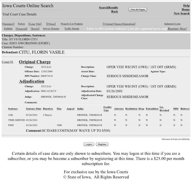 Informațiile provin de pe platforma Iowacourts.state.ia.us, unde se află documentul din martie 2000 care indică faptul că Florin Vasile Cîțu a fost încarcerat două zile în SUA.