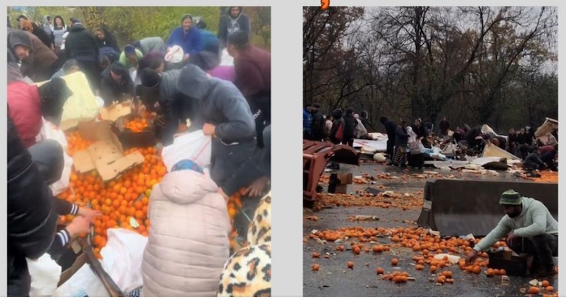 Imagini surprinse după accident arată zeci de oameni înghesuindu-se să adune fructele împrăștiate pe șosea. Martorii spun însă că, per total, au fost sute de amatori de portocale gratis. Practic, aproape tot satul a dat buzna să se îndestuleze.